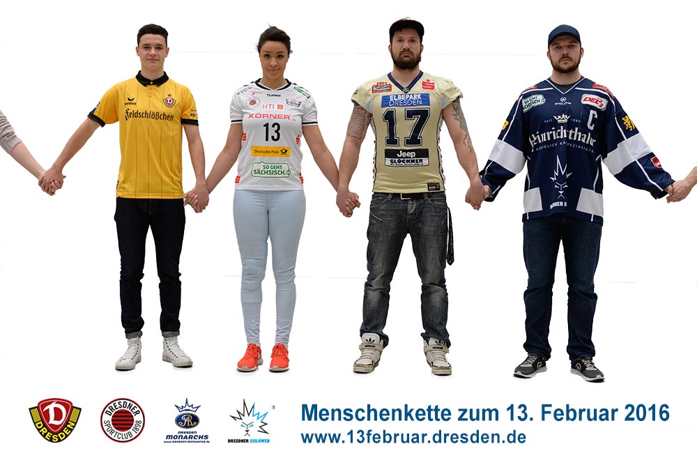 (DEL2-Dresden) (PM) - Die populärsten Dresdner Sportvereine – die Volleyballerinnen des Dresdner SC, die Footballer der Dresden Monarchs, die Fußballer der SG Dynamo Dresden und das Eishockey-Team der Dresdner Eislöwen – rufen alle Mitglieder, Mitarbeiter, Gremienvertreter, Sportler und Fans wie schon in den letzten Jahren dazu auf, sich am 13. Februar 2016 in die Menschenkette um die Dresdner Innenstadt einzureihen. Gemeinsam soll ein weit sichtbares Zeichen des Miteinander gesetzt werden.