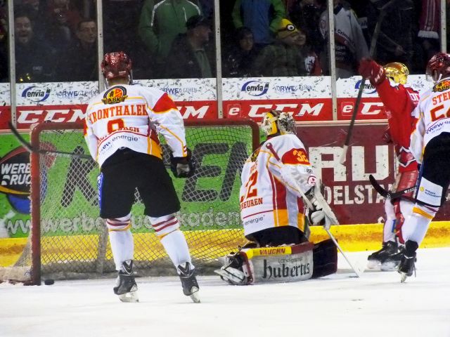 20 Minuten die eine kleine Vorentscheidung im Kampf um Platz 10 bringen könnten und die sollten es in sich haben. Das letzte Droíttel war keine 90 Sekunden alt, als sich Kaufbeuren mal wieder eine Strafe "einfing", doch den Westsachsen war irgendwie die Treffsicherheit abhanden gekommen. In der 46. Spielminute ging es dann anderesrum - Andrè Schietzold musste in die Kühlbox und die Bayern durften mit einem Spieler mehr agieren. Sie zeigten dann wie es geht und konnten das Spiel für den Moment drehen. Crimmitschau wollte nicht aufgeben und sah beim nächsten Powerplay (51.) ihre Chance zum Ausgleich gekommen. Danny Pyka konnte einige Sekunnden vor Ablauf der Strafe den Puck ins Tor befördern. Bei noch 7 Minuten auf der Uhr wurde es still im Stadion. Christoph Kabitzky ging nach einem sehr harten Check zu Boden und blieb regungslos auf dem Eis liegen. Spieler und Teamarzt versuchten "Kabu" zu helfen und konnten ihn nach mehreren Minuten des bangen Wartens in die Kabine bringen. Benommen und vor Schmerz gekrümmt musste er das Eis verlassen. Für Mitch Versteeg war das die letzte Aktion des Abends. In den 5 Minuten Überzahl konnte den die Hausherren wieder in Führung gehen, doch Kaufbeuren hatte sich noch nicht ergeben. Einige gute Chancen ließen die Gäste aus und setzten die Rot/Weißen nochmal richtig unter Druck. Eine Auszeit kurz vor Ende des Spieles und die Herausnahme von Stefan Vajs brachte nicht den erhofften Ausgleich. Olli Julkunen konnten seinen 2. Schuss auf das leere Tor mit dem 4:2 abschließen und somit auch zum 1. Mal vor heimischen Publikum ein Tor bejubeln.
