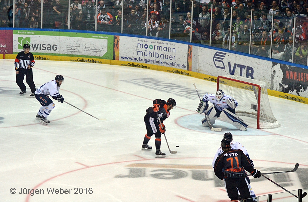 Frankfurt versuchte zu Beginn des Schlussabschnitts den Ausgleich zu erzielen, aber Richie Mueller schoss freistehend am Tor vorbei. In der 47. Spielminute nahm der Frankfurter Kapitän Vogl dann eine unnötige Strafe. Ein Fehler der Huskies an der Frankfurter blauen Linie brachte eine sehr gute Konterchance für Brett Breitkreuz. Doch Markus Keller im Tor der Kasseler reagierte prächtig. Ein weiterer Fehler in der Frankfurter Defensive brachte dann die endgültige Entscheidung. In Unterzahl wurde schlecht gewechselt und plötzlich stand ein Verteidiger gegen vier Angreifer der Huskies. Diese ließen sich dieses Geschenk nicht entgehen und Manuel Klinge traf zum 6:4-Endstand für Kassel. Frankfurt war nicht mehr in der Lage, zu kontern und verlor am Ende verdient mit 4:6 und liegt in der Serie jetzt mit 0:2 hinten. Am Dienstagabend geht es mit Spiel 3 in Kassel weiter.