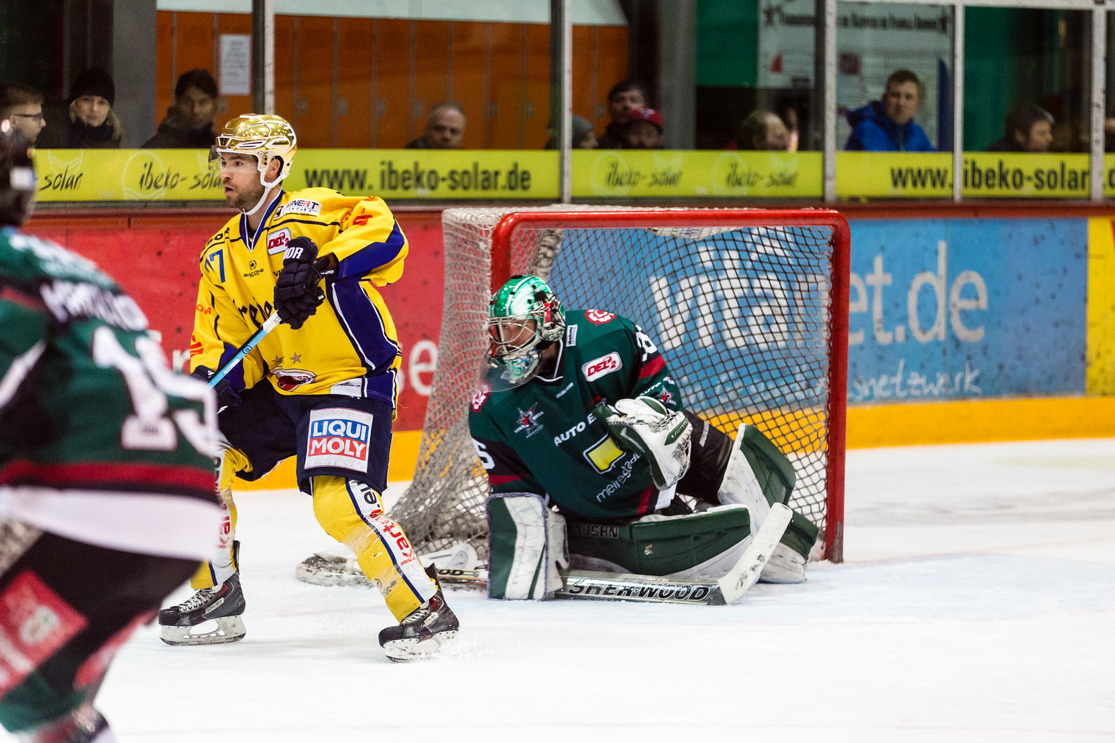 (Fotos (c) Ludwig Schirmer - Starbulls Rosenheim) - Darren Hayder (gelbes Trikot) hier im Spiel in Rosenheim gegen die Starbulls