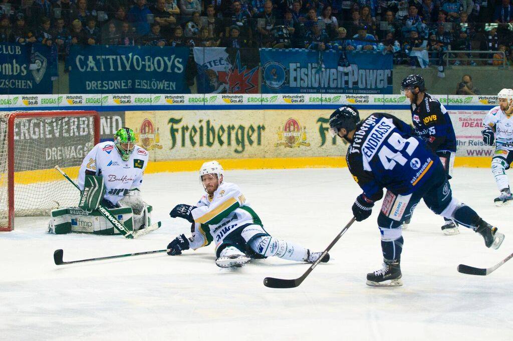 Harrison Reed und Max Campbell setzten die ersten Achtungszeichen für Dresden und prüften Sinisa Martinovic nach zwei Minuten. Auch bei einer Kombination von Mark Cullen und Michael Endraß sowie einer Chance von Dominik Grafenthin war Bietigheims Goalie gefragt. Die Eislöwen kamen durch Mirko Sacher, Reed und Campbell weitere Male gefährlich vor das Tor der Gäste. Bei einem Weitschuss von Max Prommersberger musste erstmals Brett Jaeger im Dresdner Tor sein Können zeigen. Auch bei Gelegenheiten von Dominic Auger und Marcus Sommerfeld war Jaeger gefragt. Vor der Pause verzeichneten abermals Campbell, Sacher im Powerplay sowie Petr Macholda und Jeffrey Szwez mit einem abgefälschten Schuss Großchancen für den Gastgeber, doch Martinovic im Tor und zu viele ungenaue Schüsse verhinderten zunächst noch die Führung. Doch Marius Garten nutzte in der 18. Minute die Vorarbeit von Mark Cullen zum verdienten 1:0.