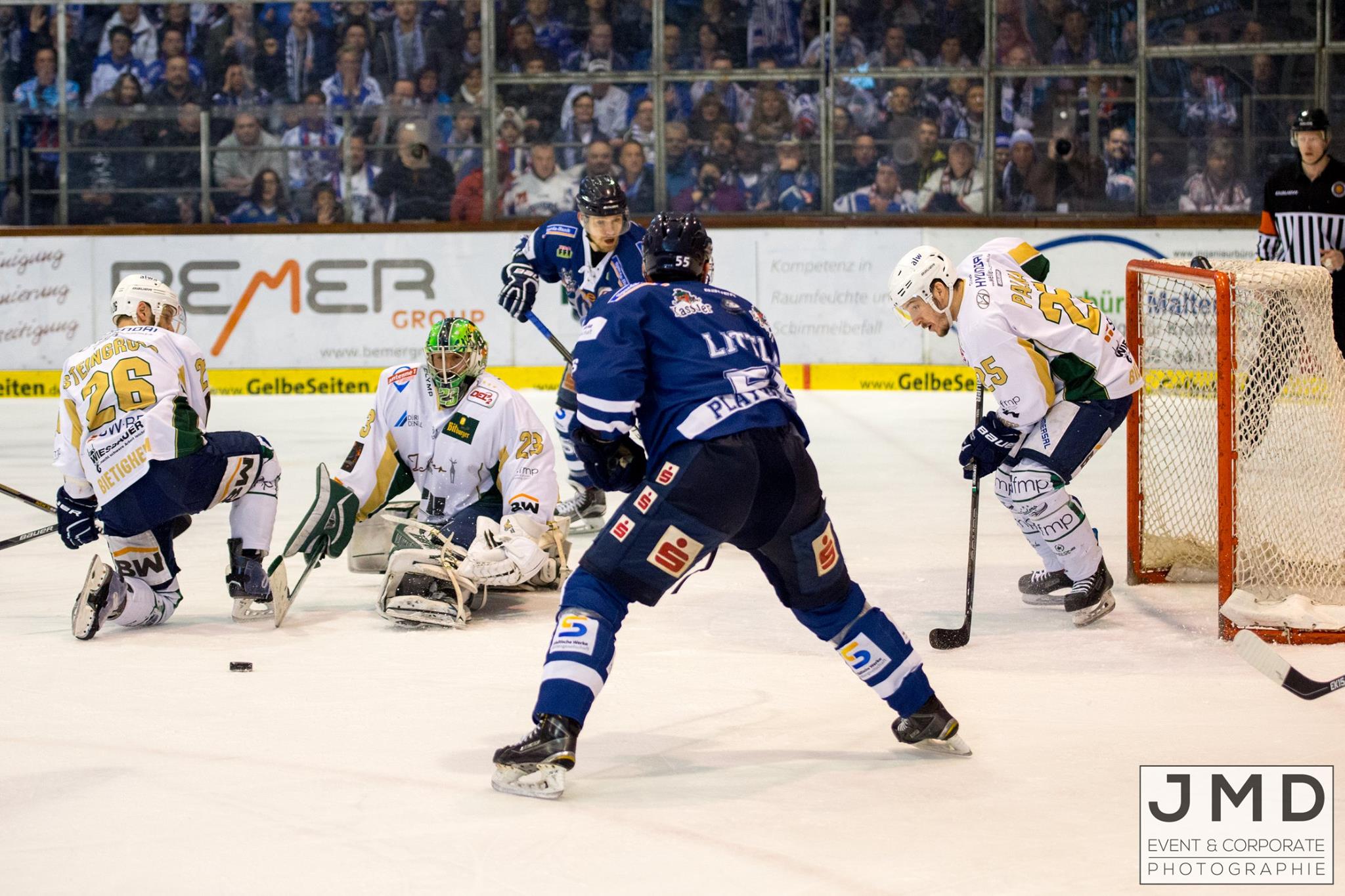 Die Schlittenhunde hatten in dieser Phase in der Defensive alle Hände voll zu tun. Im Angriff war es Austin Wycisk nach 28 Minuten, der in Unterzahl beinahe den herausgelaufenen Martinovic düpierte. In den Minuten 31 und 32 hatten Sommerfeld per Flachschuss und Just, der mit der Rückhand freistehen das Tor verfehlte, abermals die Führung für die Gäste auf dem Schläger.
