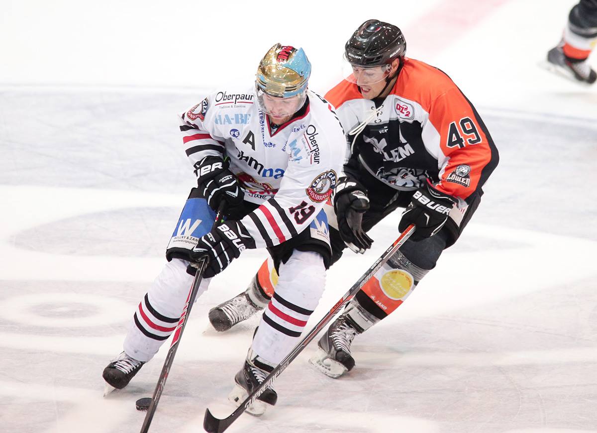 Foto: Patrick Jarrett (li.), noch im Landshuter Trikot gegen seinen neuen Mannschaftskollegen David Cespiva