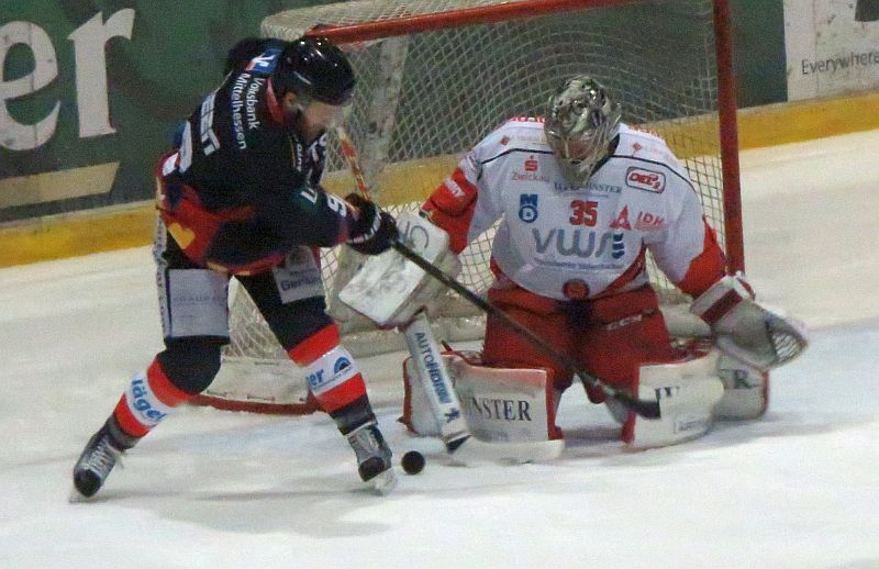 Die Gastgeber begannen wie die Feuerwehr und provozierten damit das, was Gäste-Coach John Tripp unbedingt vermeinden wollte: Strafzeiten gegen sein Team. Die Roten Teufel schossen aus allen Lagen, Ryan Nie im Kasten der Eispiraten zeigte sich aber gewohnt souverän und fischte alles weg, was auf seinen Kasten kam. Auch bei einem Schuss aus naher Distanz von Eugen Alanov war er in der 6. Minute zur Stelle und verhinderte somit die Führung für die Hessen. Als diese das Anfangspulver ein wenig verschossen hatten, kamen die Westsachsen gut in die Partie und zu zwei sehr aussichtsreichen Chancen von Pohl (8.) und Ciernik (12.), zwei Mal musste nun Mikko Rämö sein Können unter Beweis stellen. Es war ein munteres erstes Drittel mit viel Tempo und Einsatz auf beiden Seiten: Crimmitschau suchte seine Chance auf den Anschluss in der Serie, während die Kurstädter sichtlich die Matchbälle vor Spiel vier am Dienstag einfahren wollten. Das leichte Torschussplus sollte sich somit noch im ersten Abschnitt für die Hausherren auszahlen, als Radek Krestan - natürlich im Powerplay - von der Mitte abzog und durch Freund und Feind hindurch zum 1:0-Pausenstand traf.