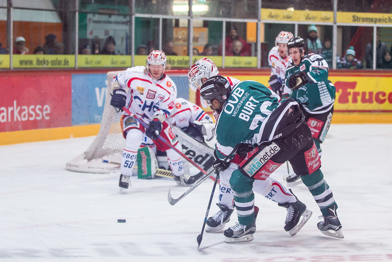 Doch die Antwort der Starbulls ließ nur 22 Sekunden auf sich warten. Schnörkellos gespielt kam das Hartgummi über Christoph Gottwald und Manuel Edfelder zu Cameron Burt und der traf aus der Halbdistanz per Flachschuss ins kurze Eck zum 1:3 (25.). Nachdem der von McNeely bediente Scofield an einem weiteren Rosenheimer Torerfolg nur knapp vorbeischrammte (27.), war es Stephan Kronthaler, dem der Anschlusstreffer zum 2:3 gelang (29.). Der Verteidiger staubte ab, nachdem Gästekeeper Hertel einen Handgelenkschuss von Classen zwar spektakulär mit der Fanghand aus der Luft holte, die Scheibe aber nicht festhalten konnte. In der 32. Minute rettete Hertel erneut – und diesmal sicher – gegen Classen, der nach einer erfolglos zu Ende gegangenen Ravensburger Überzahlsituation alleine auf ihn zufahren konnte. Eine gute Minute später musste Hertel aber erneut hinter sich greifen nachdem die Grün-Weißen eine gute Überzahlkombination über Maximilian Vollmayer und McNeely erfolgreich abschlossen. Cameron Burt traf mit einem satten Schlagschuss aus dem linken Anspielkreis unter die Latte zum verdienten 3:3-Ausgleichstreffer (33.). Erst jetzt traten auch die Oberschwaben wieder offensiv in Erscheinung, doch die besseren Tormöglichkeiten lagen weiterhin auf Rosenheimer Seite. Christian Neuert und Joseph Lewis scheiterten aber jeweils an Torwart Hertel.