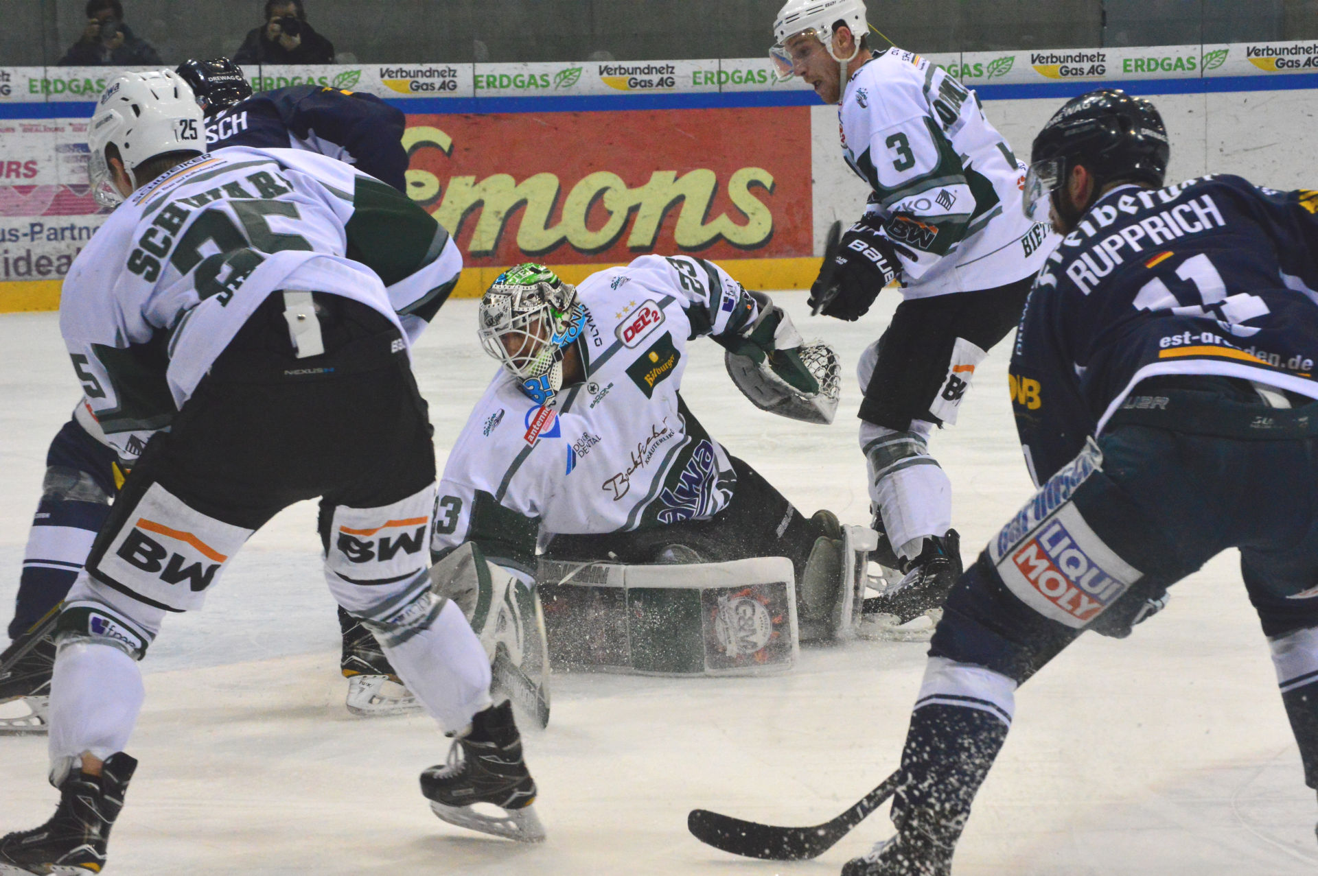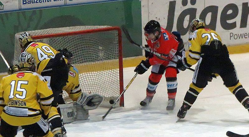 Folge zwar gefällig mit, entfachte aber kaum Torgefahr. Anders die mit drei Centern und vier Außenpärchen im Sturm sehr variabel agierenden Gastgeber, die regelmäßig zu besten Torchancen kamen und vor allem Mitte des ersten Spielabschnitts das Kaufbeurer Tor kräftig unter Beschuss nahmen. Gästekeeper Stefan Vaijs rettete gegen Greg Classen, Leopold Tausch, Tyler McNeely, Manuel Edfelder und Peter Lindlbauer mit bemerkenswerten Paraden, als er bei einem Schuss von Simon Heidenreich schon geschlagen war rettete die Latte (14.). Mit nur einem Gegentor waren die Rot-Gelben, für die Michael Fröhlich nach neun Minuten eine gute Torchance vergab, zur ersten Pausensirene jedenfalls sehr gut bedient.