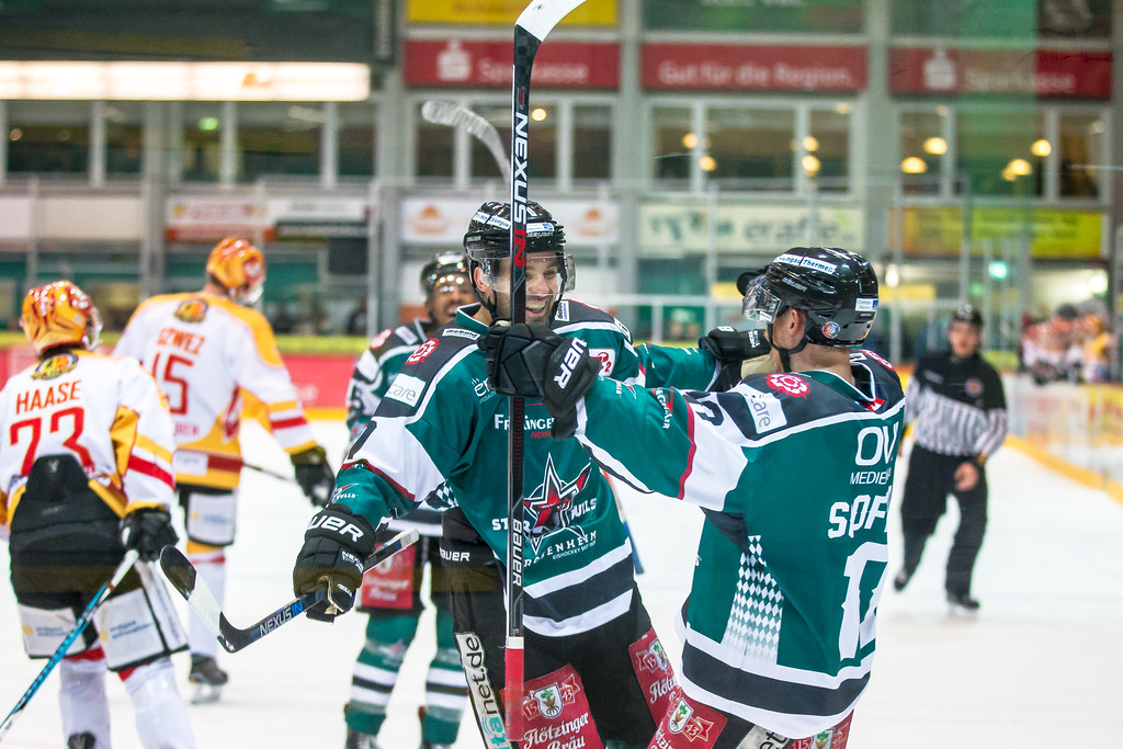 Die Partie begann mit einem Paukenschlag. Schon nach 20 Sekunden zappelte die Scheibe im Netz, nachdem Tyler Scofield abgelegt und Maximilian Vollmayer das Spielgerät direkt von der blauen Linie flach neben dem linken Pfosten zur 1:0-Führung über die Linie hämmerte. Kaufbeuren spielte in der