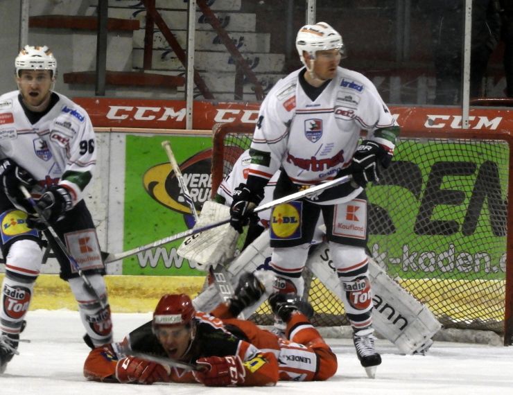 Im ersten Abschnitt konnte man klar erkennen, warum die Gastgeber in der Tabelle weit vor den Wagnerstädtern liegen. In der Spielanlage wesentlich reifer und abgeklärter hatte man das Spiel zunächst im Griff und brachte den Gegner immer wieder in Bedrängnis. Was durch kam war dann aber Beute von Goalie Vosvrda. So blieb der Bayreuther Torsteher, der sich keinesfalls über zu wenig Arbeit beschweren konnte und oftmals eingreifen musste, in Minute 15 als Mueller plötzlich vor ihm auftauchte ebenso Sieger wie kurz darauf als Mayenschein aus kürzester Distanz aus dem Slot abzog. Hätte Sebastian Busch, der in der 10. Minute einen clever gespielten Pass von Luciani aufnahm, anschließend den Goalie noch umkurvte, nicht nur den Pfosten getroffen, hätte man diesen Abschnitt sogar – wenn auch nicht dem Spielverlauf entsprechend – auf die Habenseite bringen können.