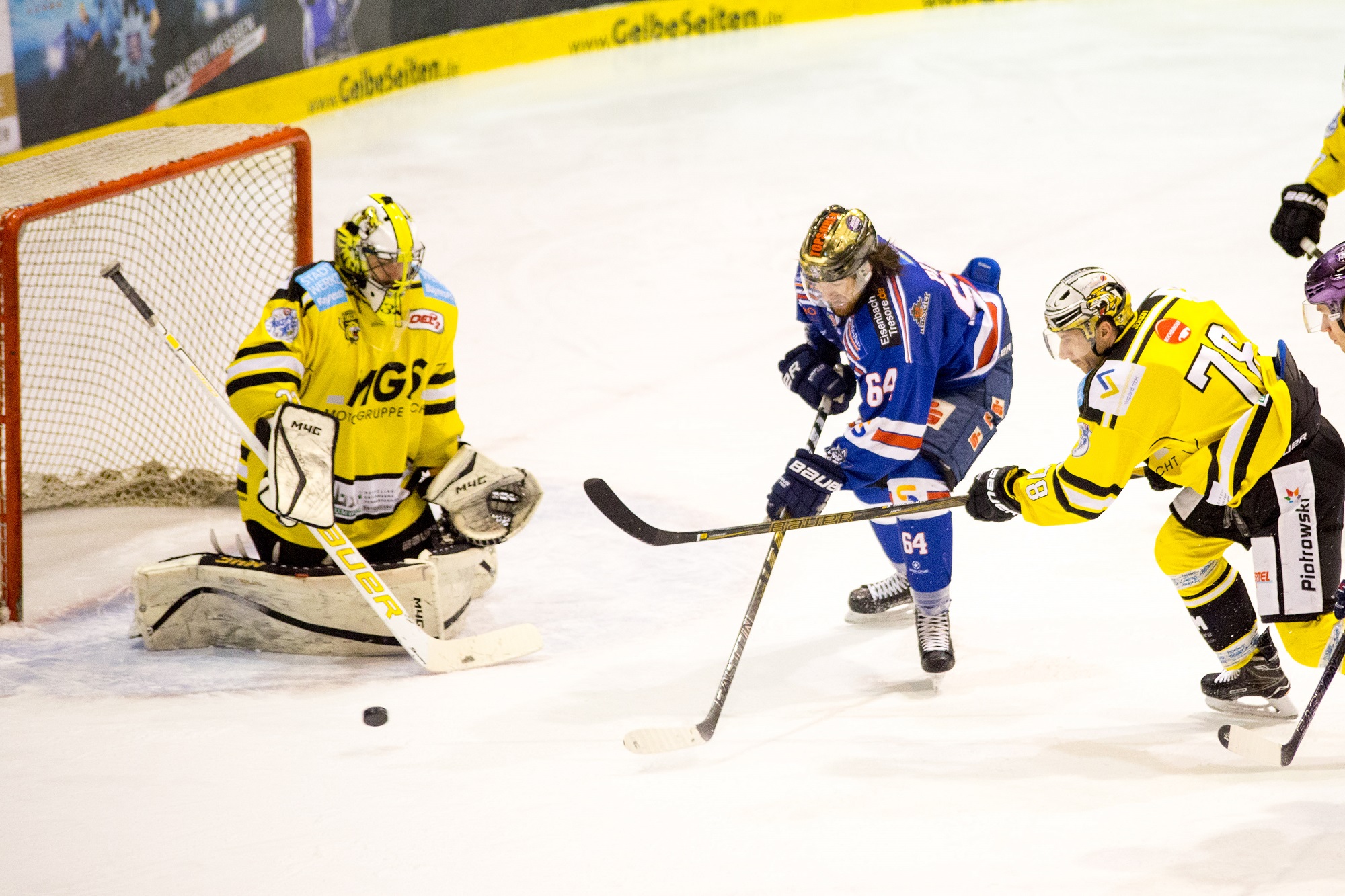 Die Ellentaler kamen erst Mitte des Abschnitts für kurze Zeit etwas stärker auf und zu ihrer größten Möglichkeit bis dahin: Sommerfeld traf nur den Pfosten, das Hartgummi fiel genau auf den Schläger von David Wrigley, doch Jan Guyrca war mit einem Megasave zur Stelle, als die Gastgeber schon die Arme zum Jubeln hochrissen. Bad Nauheim ließ ansonsten nichts zu und kam seinerseits nach einem gewonnenen Bully vor Martinovic zur 1:0-Pausenführung durch Joel Johansson, der trocken durch Freund und Feind hindurch abzog (18.). Andreas Pauli hätte sogar noch nachlegen können, sein freier Schuss in der nächsten Szene kam jedoch aus zu spitzem Winkel.