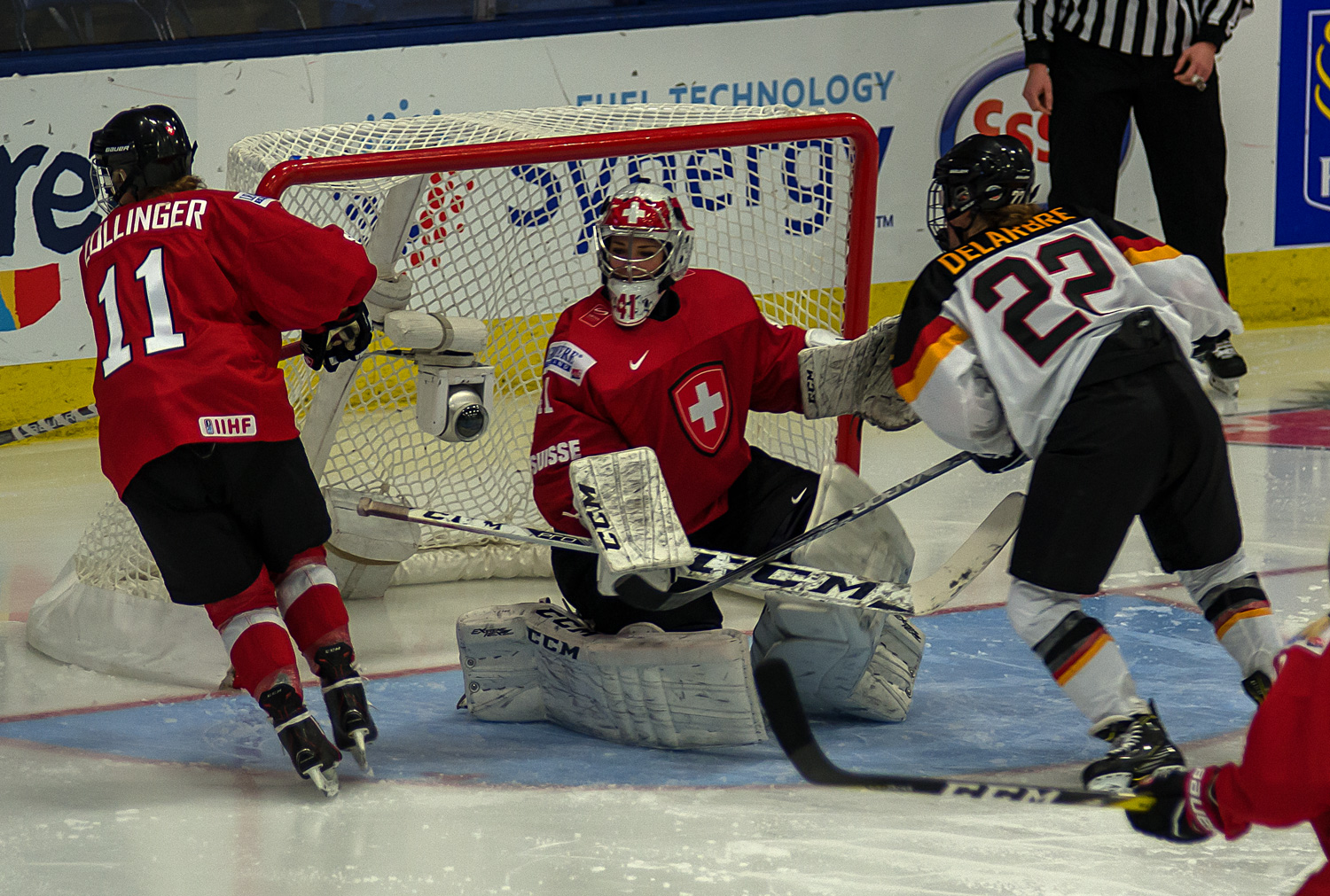Laura Stalder setzte sich durch die Mitte durch und lies Franziska Albl keine Chance. Nur 38 Sekunden später legte die Torschützin dann quer auf die mitgelaufene Alina Müller, die flach ins lange Eck zum 0:2 aus deutscher Sicht verwandelte (12. Min). Als es erneut eine Strafe gegen die DEB-Auswahl gab, waren es wieder Stalder und Müller, die auf 0:3 erhöhen. Die Schweizerinnen hatten nun Oberwasser und die Deutschen Glück, als eine Sekunde vor der ersten Pause der Pfosten einen noch höheren Rückstand verhinderte.