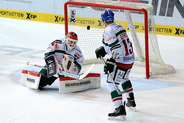 Pech hatte der AEV zudem noch, als Ivan Ciernik einen Schuss von Tölzer gefährlich abfälschte, aber der Puck hauchdünn neben das Tor ging (6.). Die Gäste waren in der Anfangsphase vor allem darum bemüht, gut in der Defensive zu stehen, hatten aber nach einem Schuss von Derek Dinger und dem anschließenden Getümmel vor dem Tor ebenfalls eine gute Möglichkeit (8.).