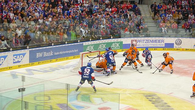 Direkt vom Bully weg machten die Gäste Druck und es dauerte keine Minute, ehe Gerrit Fauser das erste Mal vorm Mannheimer Tor auftauchte. Sein Schuss traf aber nur den Pfosten. Konnte Dennis Endras beim Nachschuss von Brent Aubin und gegen Sebastian Furchner noch parieren, so war er gegen den Treffer von Tyson Mulock zum 0:1 aus Sicht der Gäste machtlos (5. Spielminute). Auf der Gegenseite war Felix Brückmann zunächst wenig gefordert. Einzig die Reihe um Ronny Arendt, Mirko Höfflin und den zuletzt überzähligen Dominik Bittner sorgte für etwas Betrieb vorm Tor des Ex-Mannheimers, für den es heute die erste Partie zurück an seiner ehemaligen Wirkungsstätte war. Als in der 13. Spielminute Denis Reul und Wolfsburger Mark Voakes auf der Strafbank saßen, nutzte Sinan Akdag eine der wenigen Lücken in der sonst kompakten Defensive der Wolfsburger. Nach Vorarbeit von Jon Rheault verwandelte er eiskalt per Schlagschuss von der blauen Linie zum 1:1-Ausgleich (13.). Rund vier Minuten später hätte Jon Rheault sein Team sogar in Führung bringen können, doch sein Schuss blieb im Gewühl vor Brückmann hängen, so dass es beim Stand von 1:1 in die erste Pause ging.