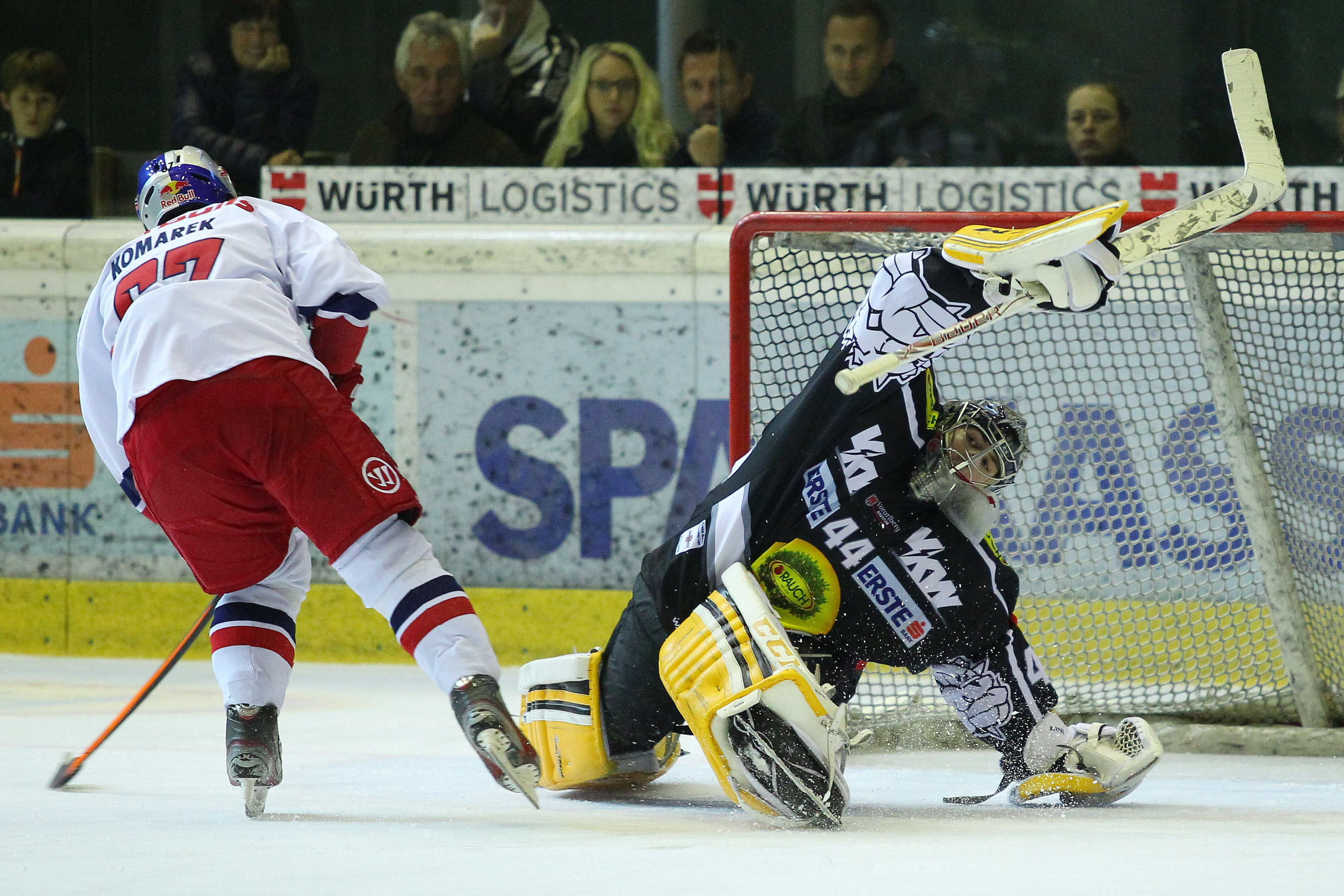 Die Red Bulls waren in den ersten zwei Dritteln die etwas bessere Mannschaft und führten nach 40 Minuten und einem torlosen zweiten Abschnitt mit 2:1. Aber dann kam das Schlussdrittel und das hatte es in sich. Gleich sechs Tore fielen in den letzten 20 Minuten, wenn gleich die Salzburger nach dem Ausgleich der Hausherren in der 41. Minute im 5:3-Powerplay immer in Führung lagen. Nach Brett Sterlings zweitem Tagestor zur 4:2-Führung wurden die Vorarlberger immer stärker und kamen, angetrieben von einem lautstarken Publikum, wieder ran. Danach legte Konstantin Komarek mit einem verwandelten Penalty wieder auf das 5:3 vor, prompt fiel wenig später der neuerliche Anschlusstreffer der Hausherren.