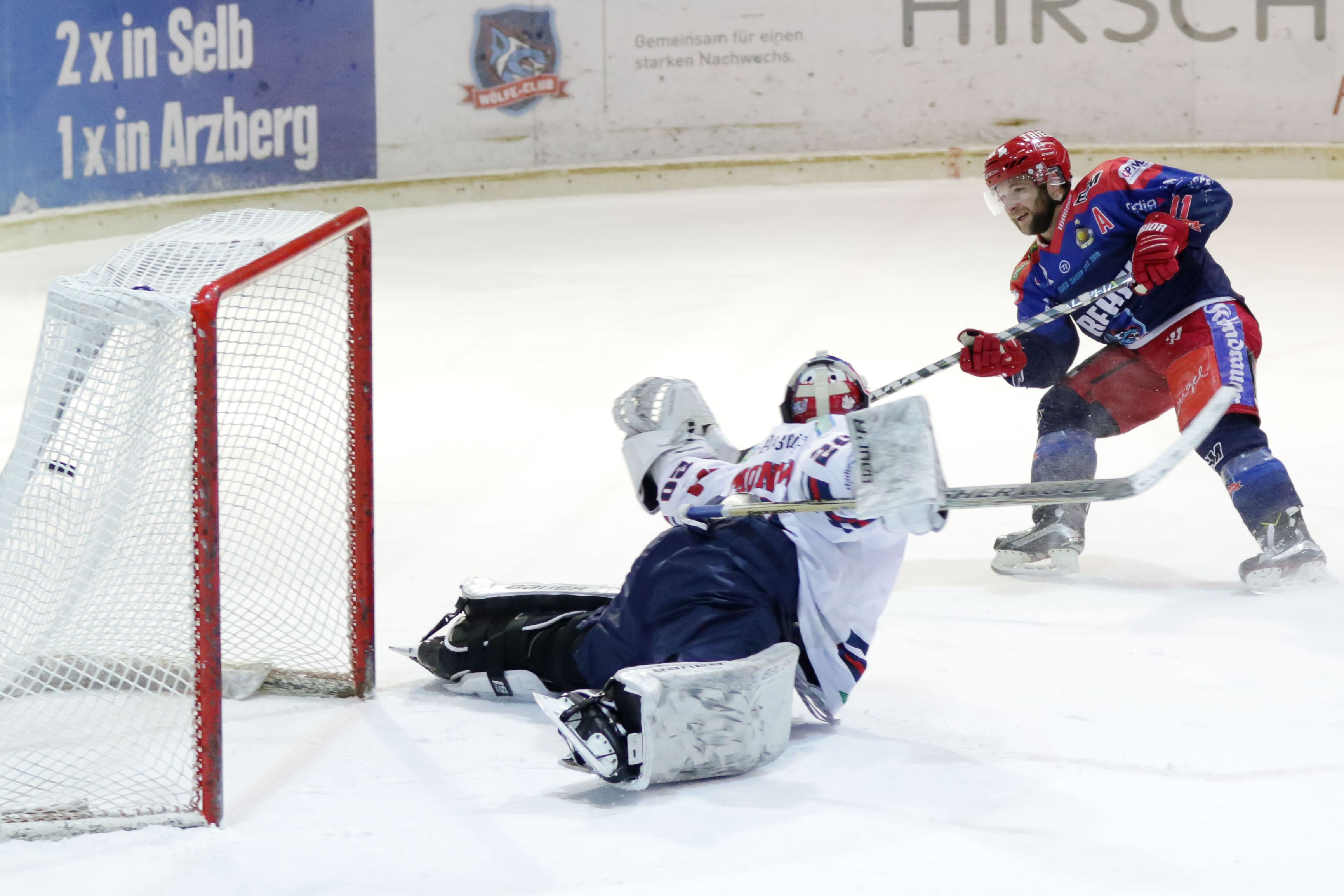 Kein Abtasten, kein Einspielen. Beide Mannschaften wollten von Beginn an klarstellen, wer der Herr im Haus ist. Gleich In der ersten Minute musste Deske sein ganzes Können aufzeigen, als Böhm allein mit dem Puck vor dem Selber Tor auftauchte. In der Folge entwickelte sich eine rasante Partie, mit zwei starken Teams auf Augenhöhe. Zunächst ergab sich eine Überzahlsituation, in der unsere Wölfe jedoch zu ungefährlich blieben. In der Folge kamen die Niederbayern immer besser ins Spiel und gewannen nach und nach immer mehr Spielanteile. Ein Unterzahlspiel überstanden unsere Wölfe noch schadlos. In der zehnten Minute war Deske jedoch machtlos. Böhm fand mit einem feinen Schlenzer die Lücke und der Puck prallte vom Pfosten ins Tor.