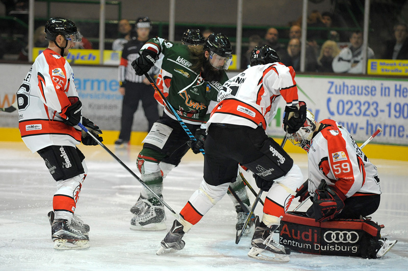 (Oberliga/Herne) PM In einer kampfbetonten und sehr emotional geführten Partie konnte der Herner EV am Freitagabend die Duisburger Füchse am Gysenberg mit 5:3 bezwingen. Zwei Doppelschläge brachten das Team von Frank Petrozza mit 2:0 und 4:2 nach vorne, entscheidend in diesem schnellen und hochklassigen Spiel war dass der HEV seine Überzahlsituationen konsequent ausnutzen und eine knapp vierminütige Unterzahl schadlos überstehen konnte. Den Treffer zum 5:3-Endstand erzielte Bradley Snetsinger gut eine Minute vor dem Ende mit einem gekonnten und lässigen Handgelenkschuss aus dem Mitteldrittel ins leere Duisburger Tor.