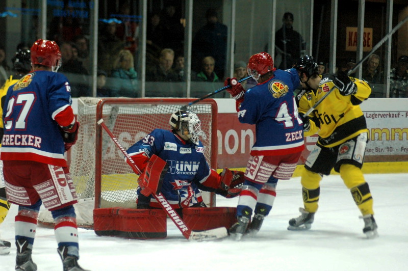 Die Gastgeber starteten zwar druckvoll, konnten aber die umsichtige Lindauer Abwehr um den sicheren Torhüter Korbinian Sertl auch bei einer frühen Überzahl nicht in Schwierigkeiten bringen, die später auch mit zwei Mann weniger auf dem Eis ohne Gegentor blieben. Umgekehrt hatten Troy Bigam, Andreas Farny und Sascha Paul Powerplay- Chancen, aber das Pech in dieser Disziplin blieb dem EVL auch in dieser Partie treu. Der zweite Abschnitt begann dann unglücklich für die Gäste, die in Unterzahl beginnen mussten. Schon nach 30 Sekunden war Beppo Frank mit einem verdeckten Flachschuss erfolgreich. Wieder einmal hatte das beste Powerplay der Oberliga zugeschlagen. Die Islanders ließen sich vor 1098 Zuschauern davon aber wenig beeindrucken, zogen ihr konsequentes Spiel weiter durch und glichen schon vier Minuten später durch einen kuriosen Treffer aus. Jiri Mikesz zog aus halbrechter Position einfach ab, die Scheibe sprang kurz vor Markus Janka auf und am Löwen- Keeper vorbei im Netz ein.
