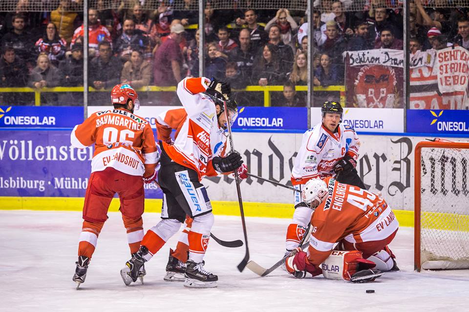 EVR-Coach Doug Irwin musste in Landshut auf die beiden langzeitverletzten Akteure Daniel Stiefenhofer und Lukas Heger verzichten. Dafür rückten die beiden DNL-Spieler Xaver Tippmann und Felix Schwarz in die Oberliga-Mannschaft auf. Daniel Fießinger feierte im Regensburger Gehäuse sein Punktspiel-Debüt und somit war der Optimus bei Mannschaft und den 600 mitgereisten Fans aus der Oberpfalz groß. Der Start in die Partie verlief für die Gäste auch nach Wunsch, denn sofort gelang es ihnen, die Hausherren unter Druck zu setzen. Für das Team von Bernie Englbrecht war es von Vorteil, dass der Sohn Englbrecht´s, Max, im EVL-Gehäuse einen Sahnetag erwischt hatte und zahlreiche Großchancen vereiteln konnte. Es dauerte lange, bis zum ersten Mal Zählbares auf der Anzeigetafel vermerkt wurde. In der 15. Spielminute hatte der EVR Überzahl und benötigte dabei nur sechs Sekunden, um durch Yannick Drews in Führung zu gehen. Nach schneller Kombination über Trew und Flache war Drews am Ende per Direktabnahme zur Stelle. Landshut hatte bis zu diesem Zeitpunkt keine dicken Gelegenheiten, brach aber in Person von Luca Zitterbart in der 19. Minute durch. Zitterbart wurde vor EVR-Keeper Fießinger regelwidrig gelegt und somit entschied Hauptschiedsrichter Lenhart auf Penalty. Diesen nutzte Youngster Luca Zitterbart eiskalt und traf zum umjubelten 1:1-Pausenstand.