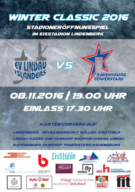 Der Vorverkauf für das „Winter Classic 2016“ beginnt bereits an diesem Wochenende. In Lindenberg im Eisstüble und beim Getränkemarkt Böller. In Lindau an der Kasse und im Fanshop der Eissportarena und in Ravensburg im Fanshop der Towerstars. Im Vorverkauf kosten die Tickets sechs Euro, am Spieltag Sieben. Kinder und Jugendliche bis 16 Jahre haben freien Eintritt.
