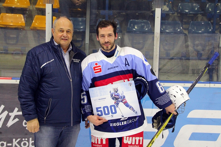 (Oberliga/Weiden) Jürgen Masching - Vor dem Spiel gegen die Höchstadt Alligators wurde Marcel Waldowsky für sein 500. Spiel für die Blue Devils ausgezeichnet. Im Tor begann diesmal Daniel Filimonow und auch Maximilian Deichstetter war nach längerer Verletzung wieder mit dabei.